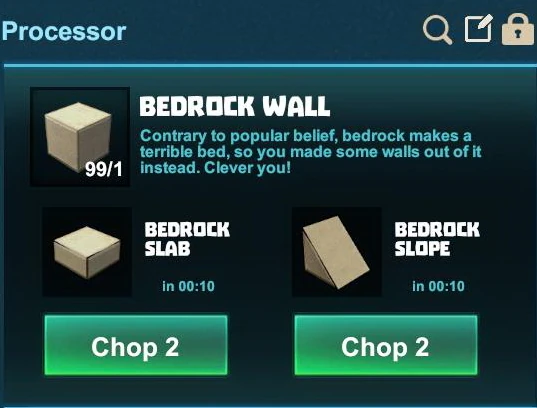 Please note that Bedrock Slabs, Bedrock Columns, Bedrock Slopes as well as inner and outer Bedrock Slope corner blocks can only be produced in a Processor from white Bedrock Walls that have to be crafted first. These Slabs, Columns, Slopes and their corner blocks cannot directly be processed from natural rough Bedrock blocks.