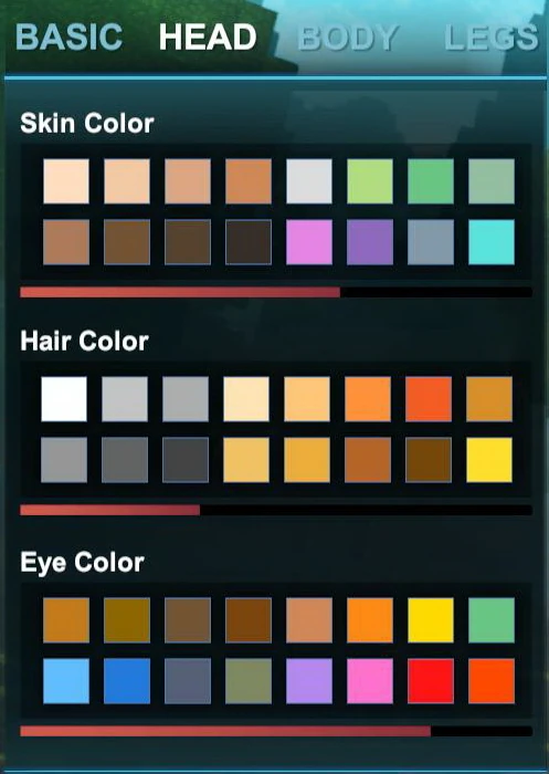 Either young male or female characters are available ("Gender"-tab, although some faces look quite gender-neutral), with 4 different faces/heads to choose from each, 7 hair-styles (plus "none"), 26 different skin-tones, and 48 colors for hair, 20 eye-colors and 48 colors for 5 parts of clothes each. Visuals for characters will be revised in the near future.