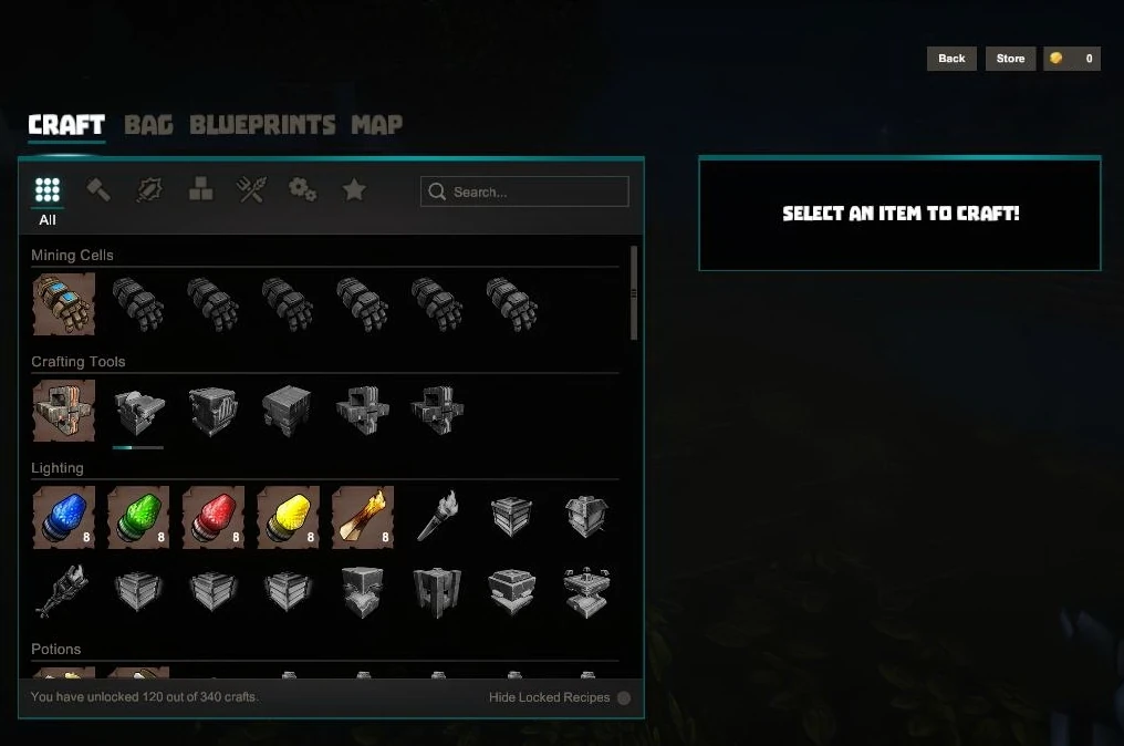 To craft something, click on the colored icon of any unlocked crafting recipe you wish to craft to see which materials you'll need.