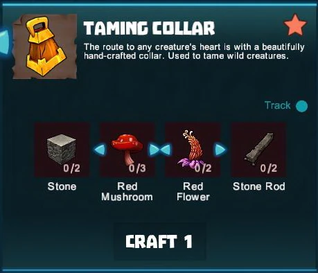 For taming you'll need to craft and equip a Taming Collar (after crafting Stone Mining Cells and Basic Health Potions) and you will then have to use it on a Creature constantly for the duration of a few seconds (except for Ghosts and Creatures spawned on a Mob Spawner). You'll see the exact required time in seconds displayed while taming, ranging from 10 to 60 seconds depending on the type and power of Creature.