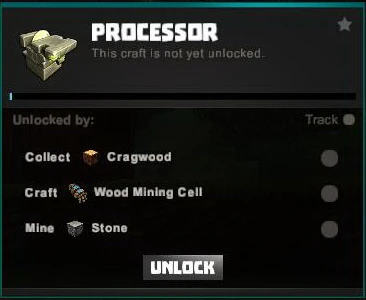 the Processor to process materials/blocks/bars into Slabs, Rods, Twine, Pigments, Bones, Goo, Seeds, etc. No crafting recipes have to be unlocked in order to use a Processor