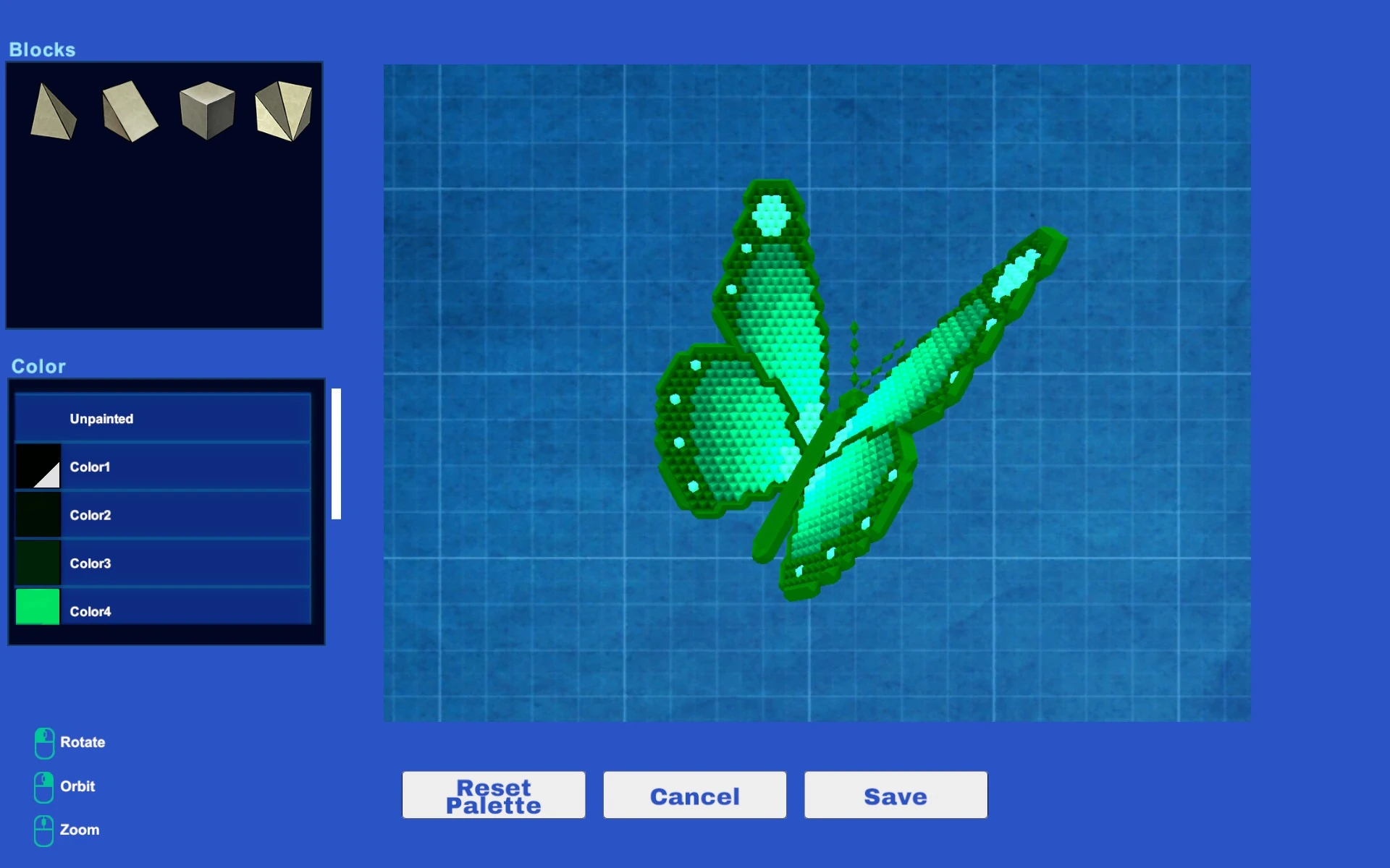 You can also change the colors the Blueprint uses in the same interface - just click on the color you wish to change in the list in the bottom-left corner of the customization UI. Note that you can only change everything that uses the same color at once - if you have, say, Dirt and Stone that are both colored blue, you cannot make Dirt green and leave Stone blue. Unpainted blocks are considered as a single color, so if a Blueprint does not use Paint at all, you can only color the Blueprint as a whole.