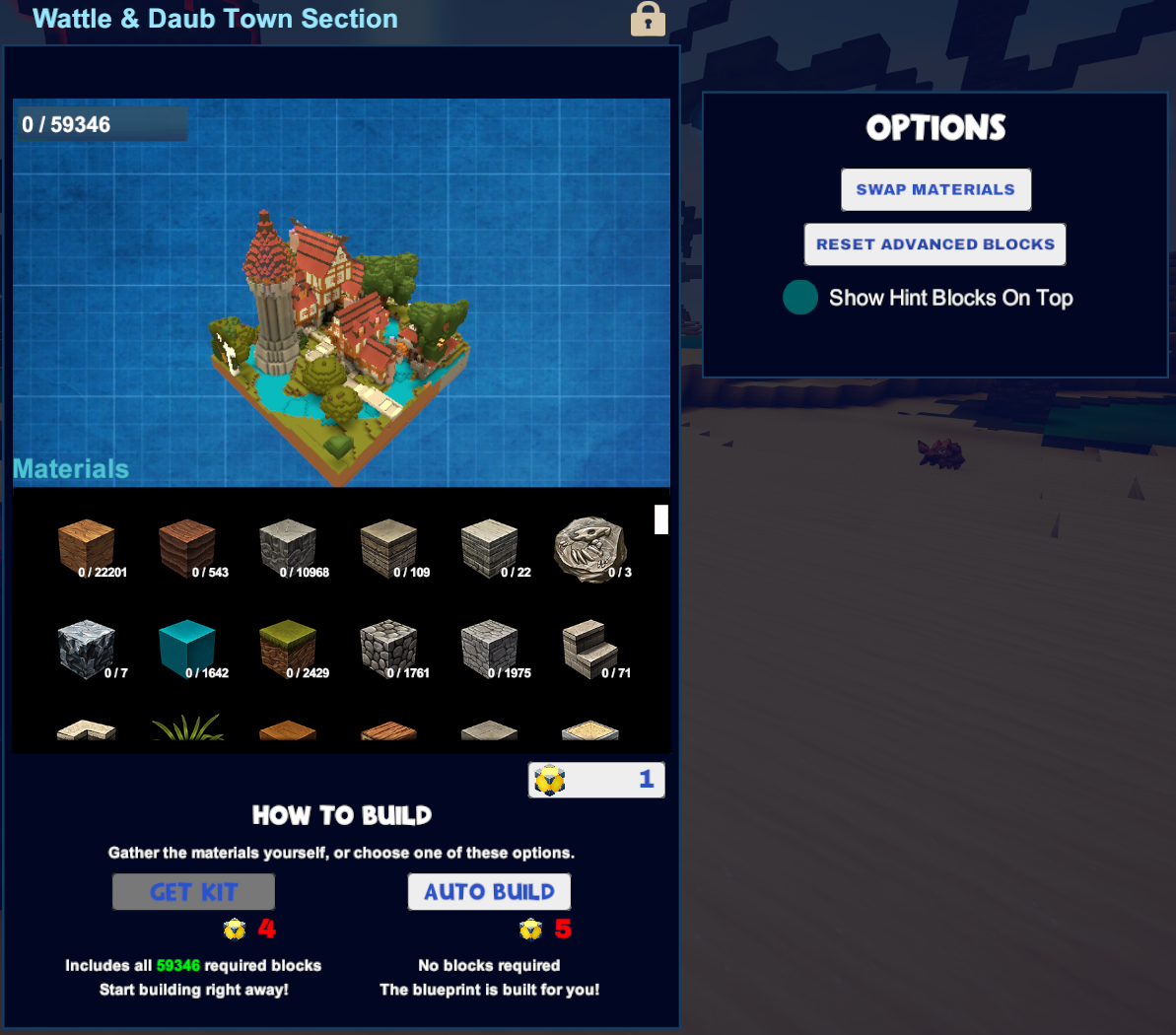 - you might rather prefer to refrain from buying a building kit until you have checked the specifics of the Blueprint and customized it to your liking - then you can buy a building kit with the customized blocks, objects and placeable materials inside that you prefer