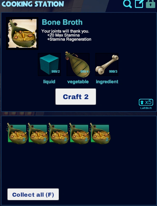 In order to cook Bone Broth, you'll have to place a Cooking Station into the world and activate it (right-click or default key "f") while pointing your cursor at it. Depending on the ingredients you will now fill into the slots after clicking on the Soup recipe, different kinds of Soups can be produced.