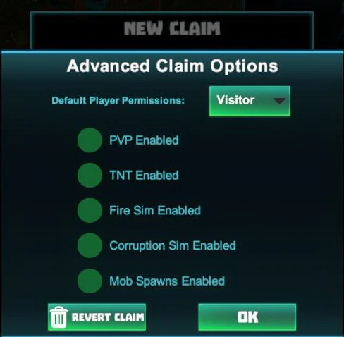 - everyone is set to "visitor" permission rank on claims by default. You can alter this by selecting one of your claims on the area map by clicking on it, then clicking on the "hammer" icon in the middle, selecting "Advanced Options" and clicking on "Visitor", which will bring up a drop-down menu where you can select the setting.