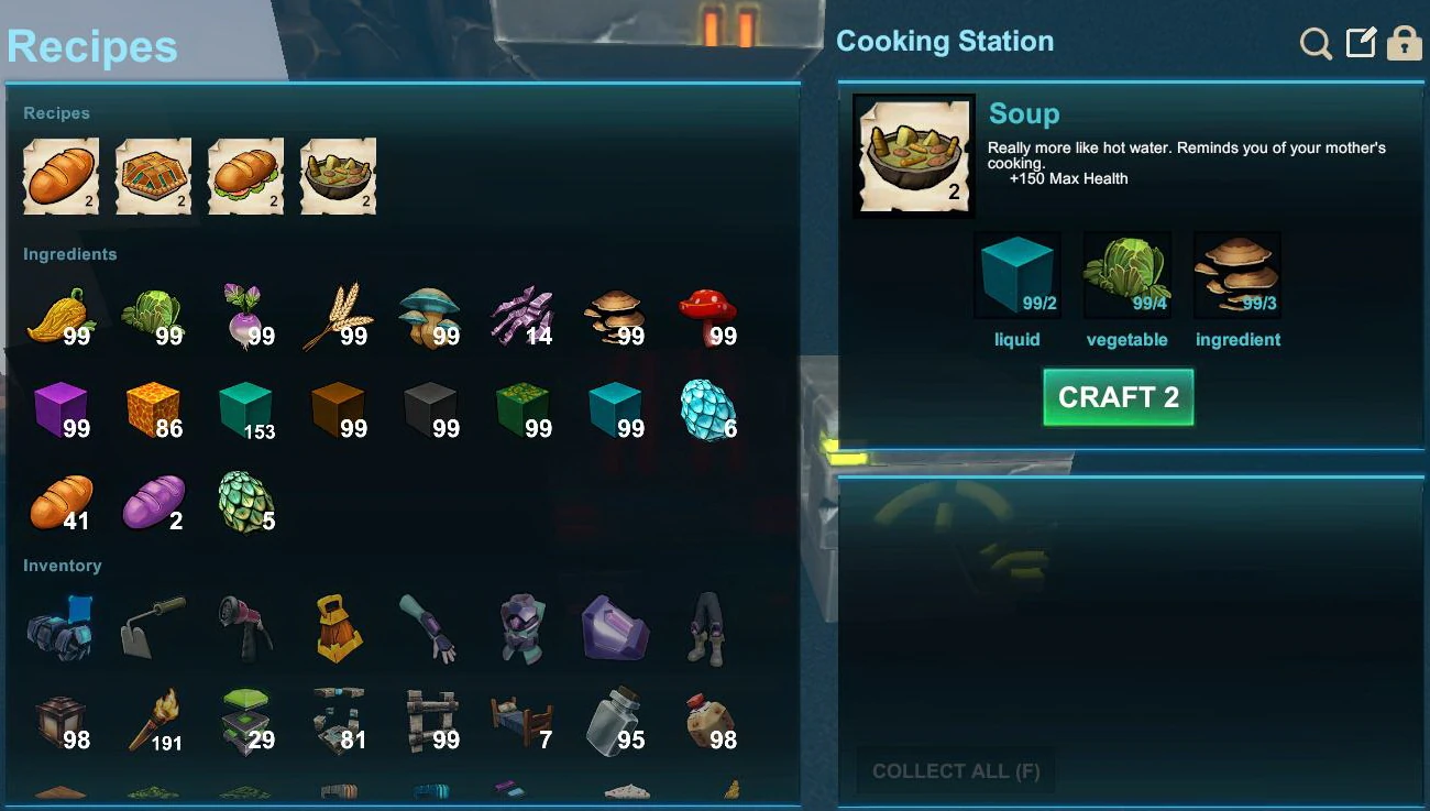 - obtain (any type of) Soup like by choosing the recipe for all types of Soup in your Cooking Station and then inserting 2 units of any liquid together with 4 Vegetables (either Crisphead Lettuce or Turnips) and 3 more ingredients like Turnips, Lettuce, Horned Melons, Mushrooms, Chizzard Eggs, Blizzard Chizzard Eggs or Questionable Jerky. Corrupted Soup made from Corrupted Water is very helpful for explorations and hunts on the Corruption layer