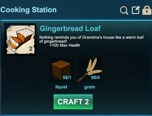 | Gingerbread Loaf | +100 Max. Health | Used for crafting | 4x Wheat and 1x Molasses |