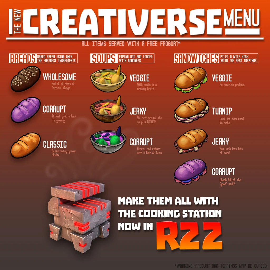 | Corrupted Sandwich | -200 Max. Health | +100/200 Max. Stamina, Inverse Corruption Damage | 2x Corrupted Bread + 3x any valid vegetable + 3x any valid ingredient |