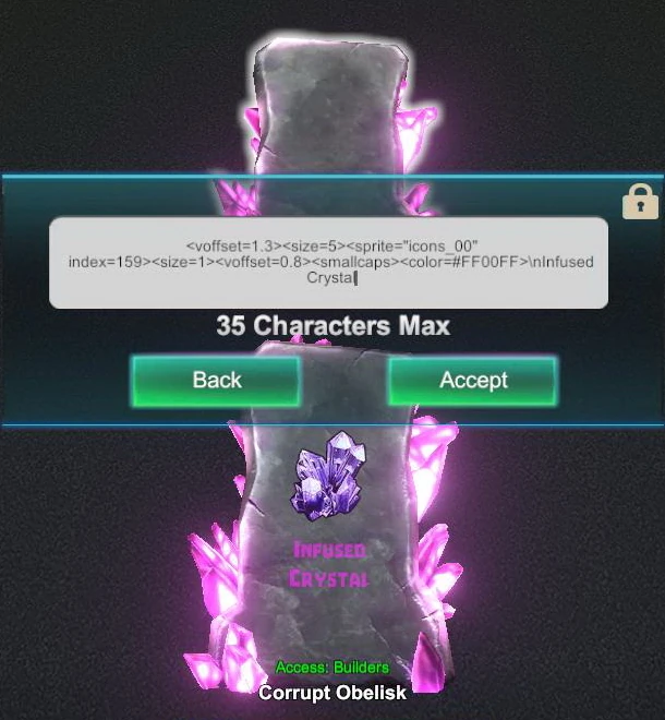 So after you've changed the message of the Obelisk, this message (including rich text code and codings of images) will be shown as the name of the Obelisk in the naming array. And if you rename the Corrupt Obelisk in the naming array, the message on the Obelisk (including rich text commands) will be overwritten with this name. As a weird side-effect you can use rich text commands in the naming array of Corrupt Obelisk, which is usually not possible for any other nameable objects.