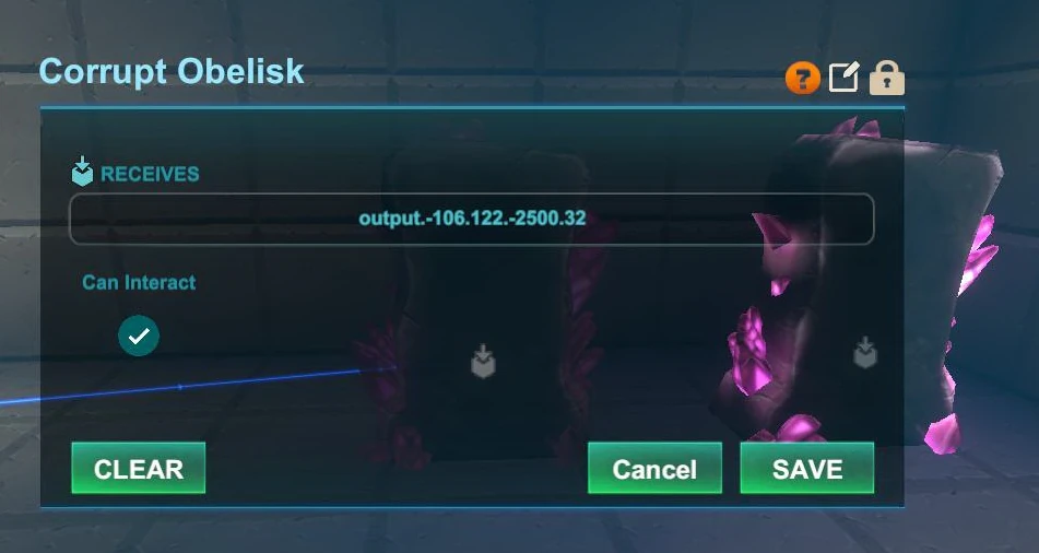 click on this icon in order to change the permission settings so that only other players with a specific or higher permission rank than this defined permission rank can use or even take this object- toggle manual interaction - the Corrupt Obelisk can be "locked" by disabling the "can interact" button, so other players will not be able to switch on/off the Corrupt Obelisk directly (except if they have a high enough permission rank that allows them to use a Wiring Tool on your Corrupt Obelisk and change this interaction option