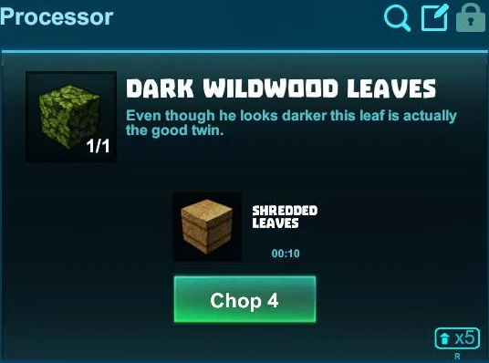 One block of Dark Wildwood Leaves can be cut into 4 blocks of Shredded Leaves in a Processor at a time. No crafting recipe is required for this. Simply carry blocks of Dark Wildwood Leaves with you in your inventory and activate a Processor in the game world with right-click or "f" (as the default key) while pointing your cursor at the Processor.