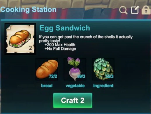 In order to cook Egg Sandwiches, you'll have to place a Cooking Station into the world and activate it (right-click or default key "f") while pointing your cursor at it. Depending on the ingredients that you will insert into the slots after selecting the Sandwich recipe, different kinds of Sandwiches can be produced.