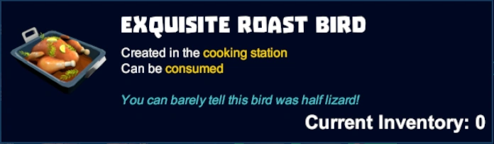 Exquisite Roast Bird is a type of consumable Food that can be cooked in a Cooking Station.