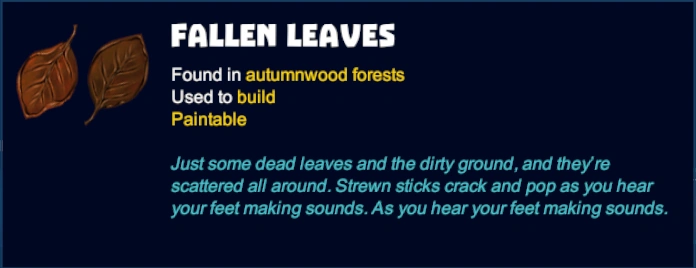 Fallen Leaves are decorative items that always have a brown color though, there are no yellowish or reddish variants. Fallen Leaves, Leaves blocks as well as whole trees do not spawn by themselves after world generation in Creativerse.
