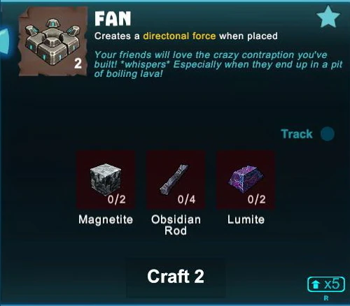 A Fan is a functional item that players can craft in their Crafting Menu (default key "Q") or at any Crafting Table in older Creativerse-worlds.