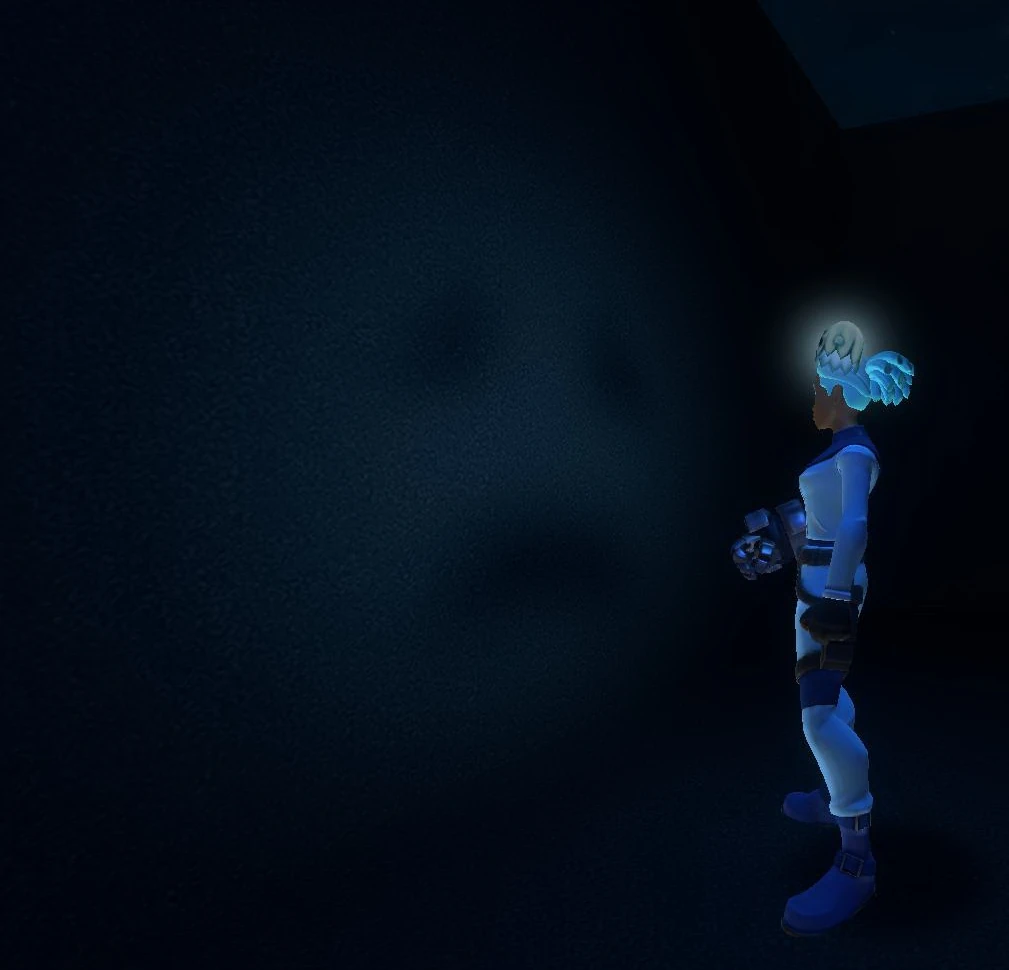 The Ghostly Flashlight emits a blueish light that is dimmer than the common Flashlight, and has a spooky face that can be seen best if you point the flashlight "beam" directly against a wall. The range of the light depends on where you'll point your cursor at, but it's a little longer than that of the common Flashlight that looks like a small cyan cube.