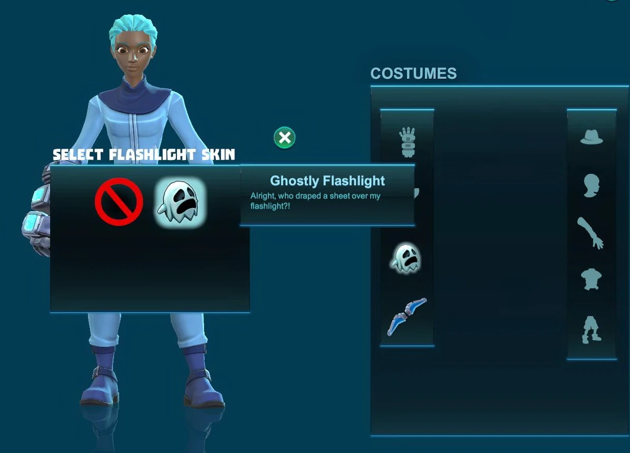 To deselect the chosen Ghostly Flashlight costume "skin" or to select another one, simply click on "Costumes" and then on the according flashlight costume slot once again to chose either another costume or none (by clicking on the red crossed-out circle).