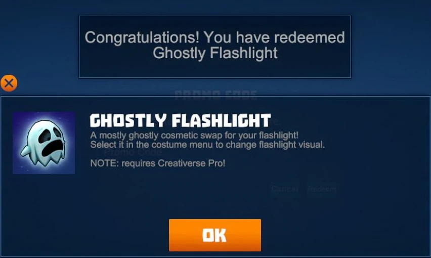 The Ghostly Flashlight is a seasonal Halloween costume skin for the flashlight that is part of the "Pro"-DLC for Creativerse. The Ghostly Flashlight does not provide F2P players with the Flashlight feature, but will only be selectable for them after they will buy or obtain the Pro DLC in the future.