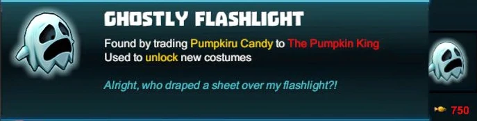 During the second Pumpkiru's Community Candy Campaign that started on October 24th 2018 and ended on November 14th 2018, players could buy the Ghostly Flashlight as a "featured" Costume from The Great Pumpkiru or Pumpkiru Jr. for 750 Pumpkiru Candy.