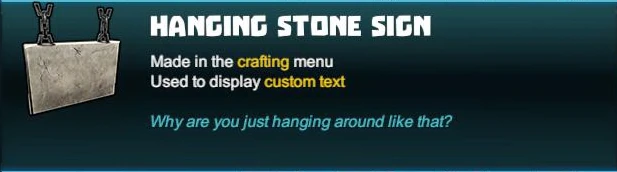 Right-click on a Hanging Stone Sign in the game world or activate it by typing "f" (as the default key) in order to write a note or message (maximum length 35 characters).