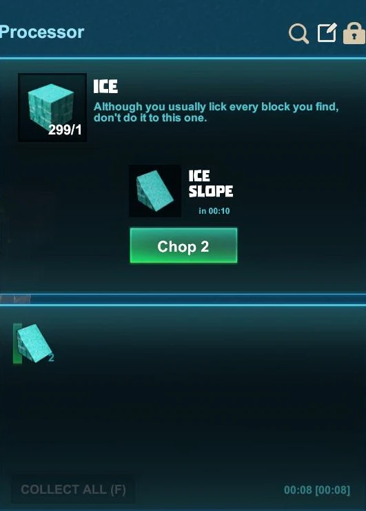 It will then take some time for each Ice block to be processed into Ice Slopes - both the time that one item(-stack) and all of them in the queue will take to be done is shown in the Processor Window beforehand.
