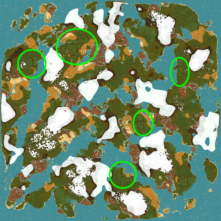 Jungle biomes are circled in green
