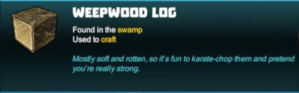 Weepwood Logs and Mossy Weepwood Logs can be found on green Grass or in Bog Water, but only in Swamplands close to Weepwood-trees.