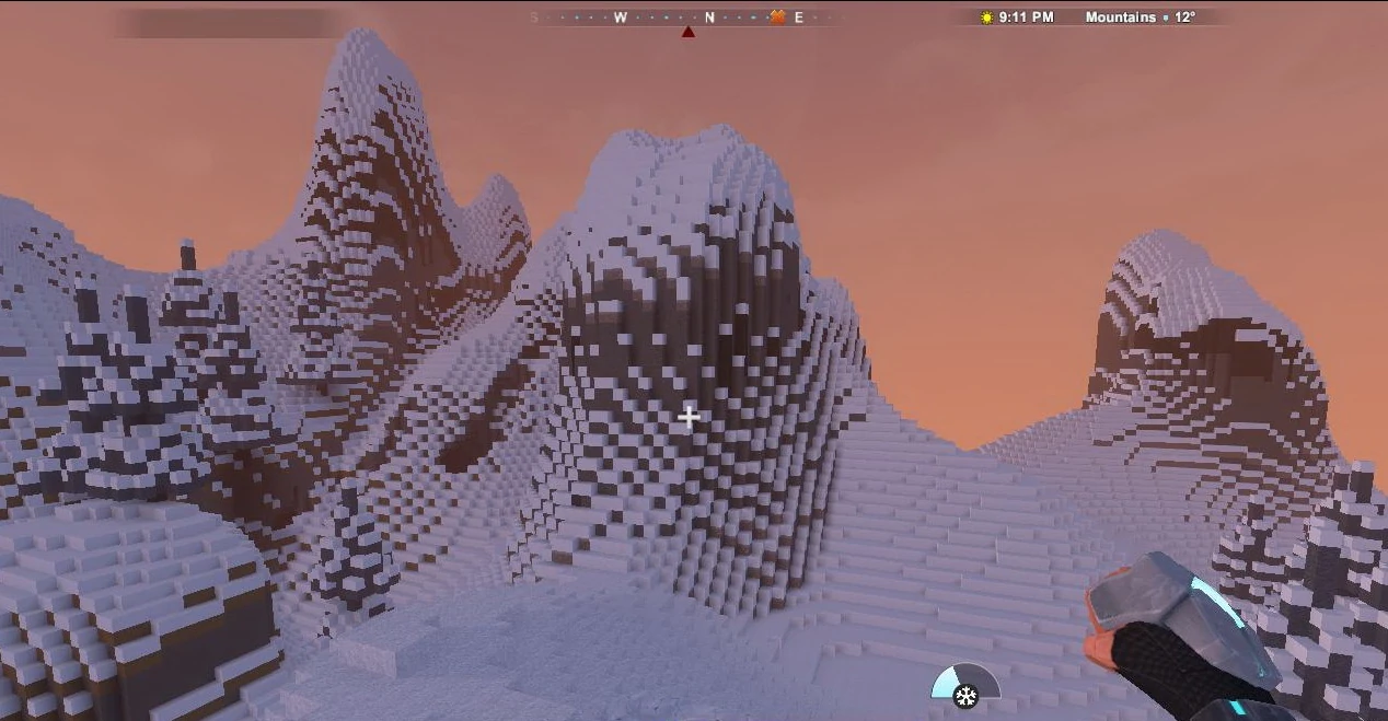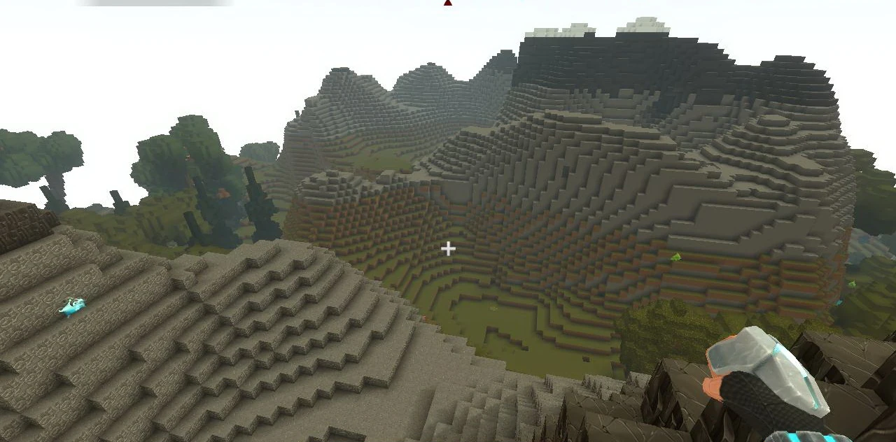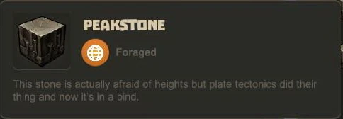 You can come across different looking Mountains in Creativerse. Mountain-biomes can be made of rather small Mountains consisting of grey Stone, Dirt and Grass up to large ones covered with Snow all over, with green valleys in between, and some with dark lines of Peakstone in between or on the very top. "Striped" mountains in different shades of reddish to sandy brown belong to Canyons though.