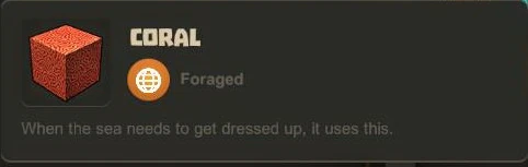Oceans consist mainly of Water and Sand, with large underwater growths of Coral appearing in the open ocean. Occasional sandy islands dot the horizon. Driftwood can often be found lying at the bottom of the ocean.