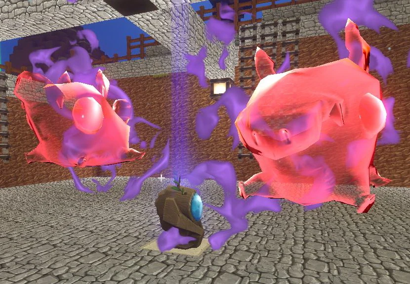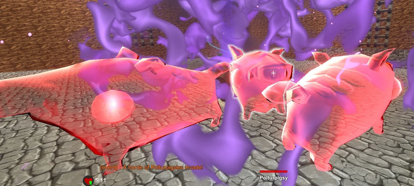- Polturpigsy Horde: 4 waves/groups of large red colored aggressive Polturpigsies will appear and have to be defeated one wave after the other. Usually one wave consists of 3 Polturpigsies spawning at a time, but sometimes less. Only after one wave has been defeated, the next wave will spawn
