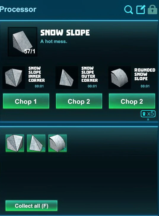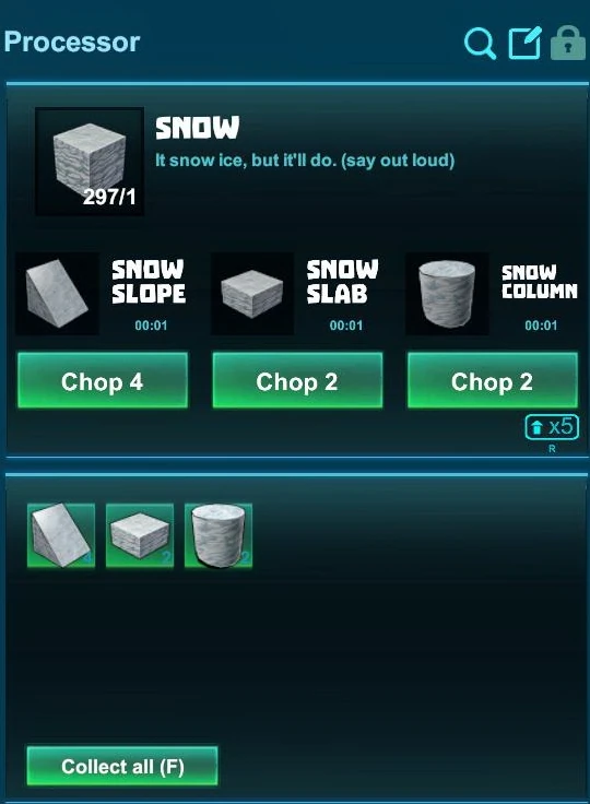 Since update R56 on September 27th 2018, any block of pure Snow can be put into the Processor and cut into either 4 Snow Slopes, 2 Snow Columns or 2 Snow Slabs. Snow Slopes can be processed further into inner and outer corners as well as into Rounded Snow Slopes.