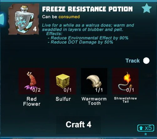 Frigid Food can be made with Blizzard Chizzard Eggs as ingredients (only harvestable from tamed Blizzard Chizzards, not by killing them). Frigid Soup will cut freezing damage in half, while Frigid Pie and Frigid Sandwich will both even turn the freezing damage into an healing effect. This applies also to the freeze damage that Blizzard Chizzards, Rambeaus and Arctic Mirus can inflict. Food will not affect the freeze scale though.