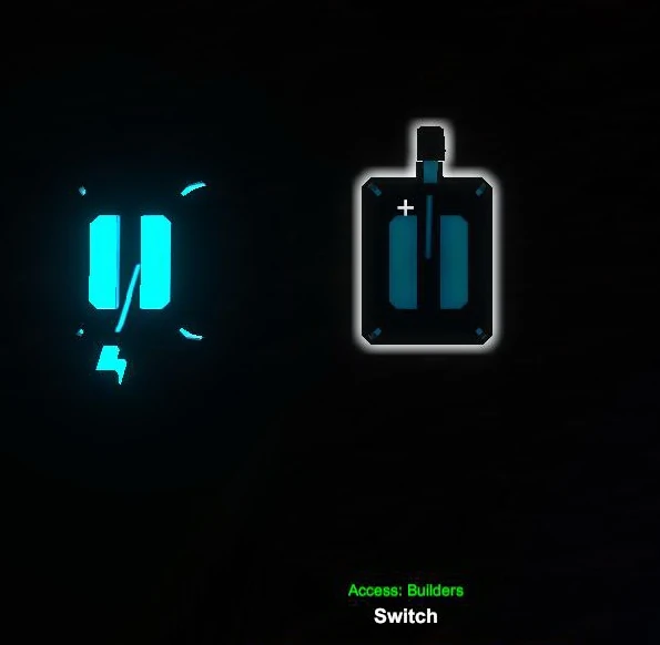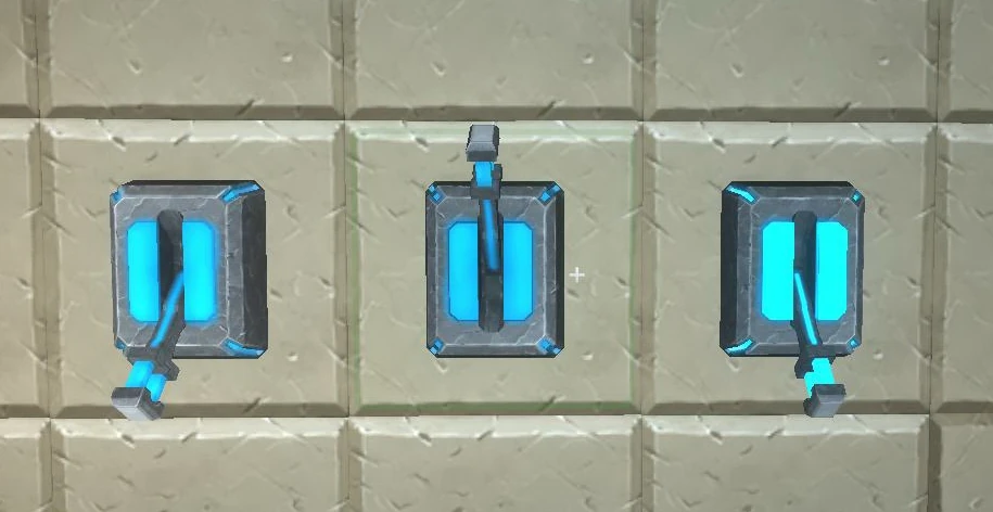Common Switches can be crafted in the crafting menu (to be opened by typing "Q" as the default key) and look like levers in the typical Arctek design of Creativerse - the basic elements of the Switch look like they're made of grey stone with futuristic light blue parts on the panel at the base and also on the lever itself. The cyan blue patterns on the Switch will glow brightly when being activated and such can be seen from afar in the dark.