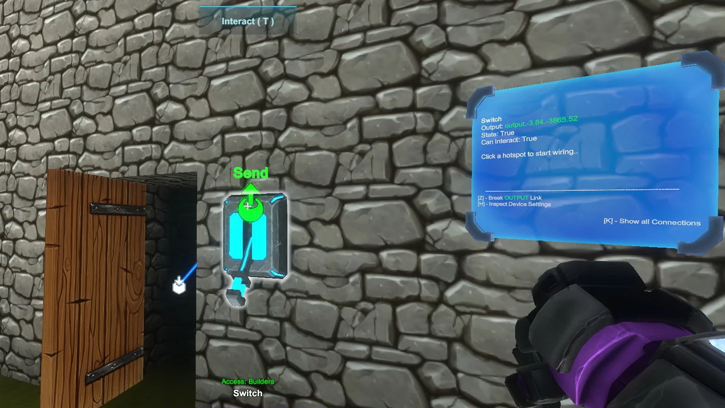 Optionally, operating gates can be wired in between, like Logic Gates, Flip-Flop Gates, Delay Gates, Inverter Gates and/or Number Comparison Gates. This enables players to lock activatable objects so that they can only activated/deactivated by certain codes that can be shared with specific players, or to create puzzles, to use timers, frequences and much more. For this, you'll have to connect the "Send" Hotspot of Switches to the "Receive" Hotspot of any operating gate/s that you can also link together to create Machines.