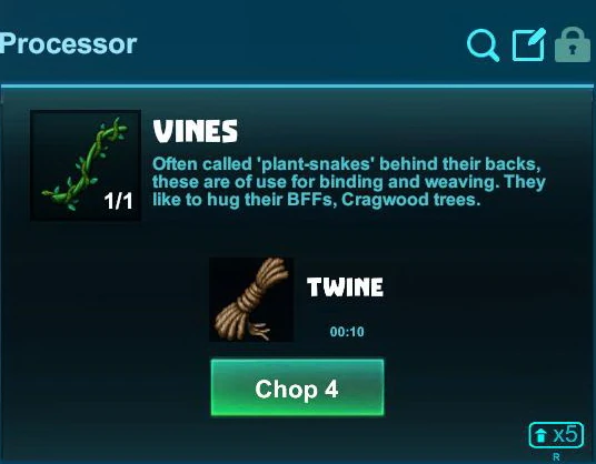 1x Vines can be processed into 4 Twines each, or 1 Sinew will also be processed into 4 Twines at a time.