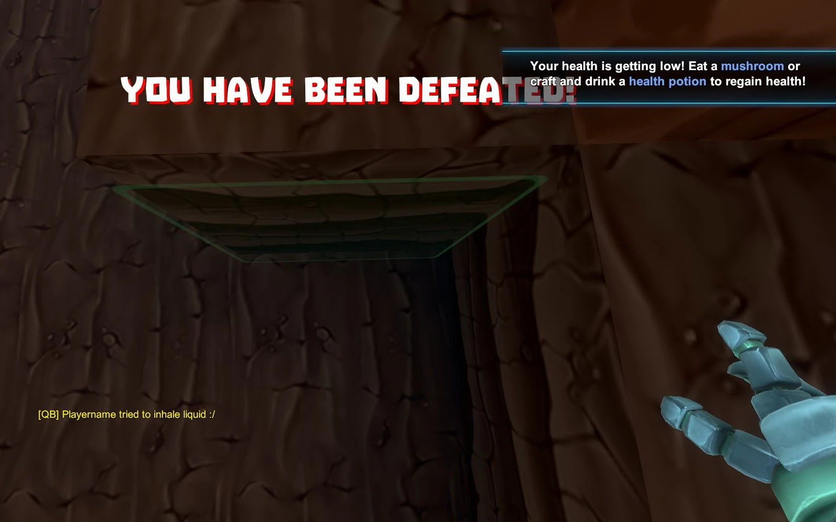 When drowning, the player character's health bar will shrink quickly (100 health points per second in "normal"/medium combat difficulty), so if the player character does not cut surface soon, they will be "defeated" when the health points drop down to zero. The system message " *playername* tried to inhale liquid :/ " will be displayed in the chat at this point, and the message "You have been defeated" will appear in the middle of the screen.
