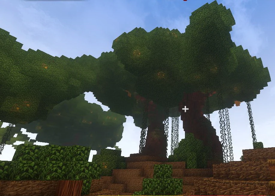 Blocks of Wildwood can be taken from large Wildwood trees in Jungle biomes with two different kinds of dark green leaves and also two kinds of pink and orange Wildwood Flowers in large amounts that brightly glow golden in the dark. Wildwood usually has a lot of Vines growing on it; much more than Cragwood, and strands of Vines often hang down from their tree tops to the ground as well