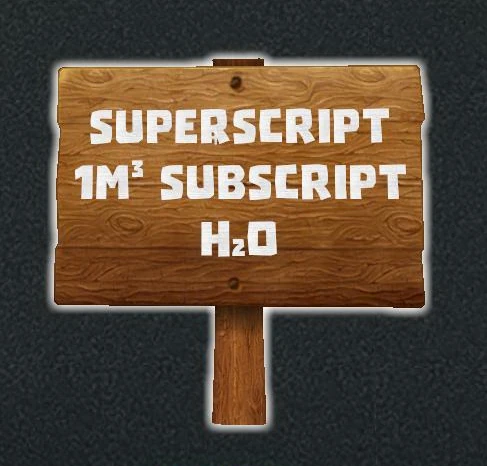 Syntax: <sup>text</sup> and <sub>text</sub> Example: Superscript 1m<sup>3</sup> Subscript H<sub>2</sub>O Allows for Superscript and Subscript