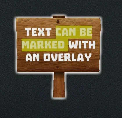Syntax: <mark=[hex color code with transparency]>text</mark> Example: Text <mark=#cc0000cc>can be marked</mark> with an overlay Colored text overlay