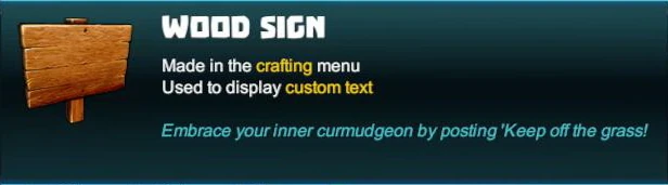 After placing a Wood Sign into the game world, right-click on it or activate it by typing "f" (as the default key) to write a note or message (maximum length 35 characters). After clicking the "Accept"-button, this message will then be displayed in ALL capital letters by default (which can be changed with a command though).