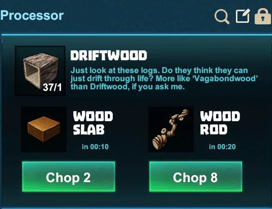 They can be produced from nearly any type of uncorrupted Wood or Logs in a Processor. These flammable Slabs can be used for crafting, for building purposes, to be processed into Wood Rods and as a Fuel (the latter is not actually recommended).