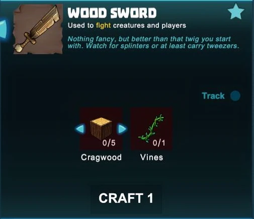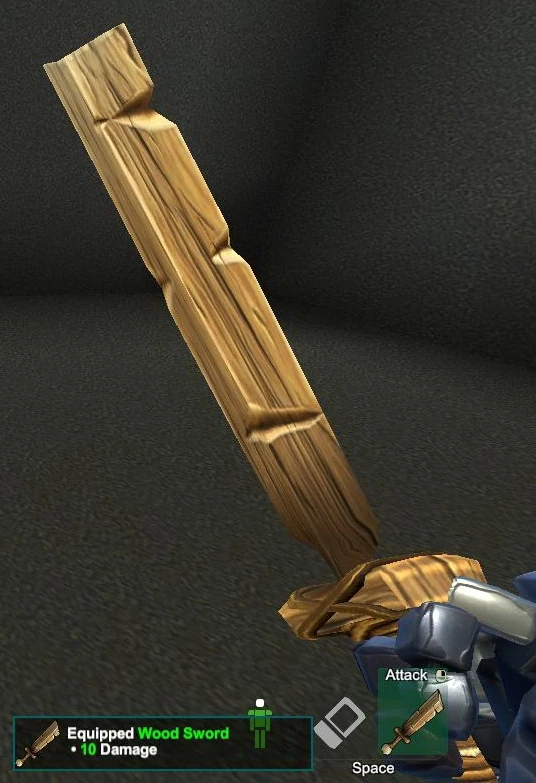 The Wood Sword is the first melee weapon that you can craft, and definitely better than your awkward starting Twig (that you cannot see/unequip as an item any longer).